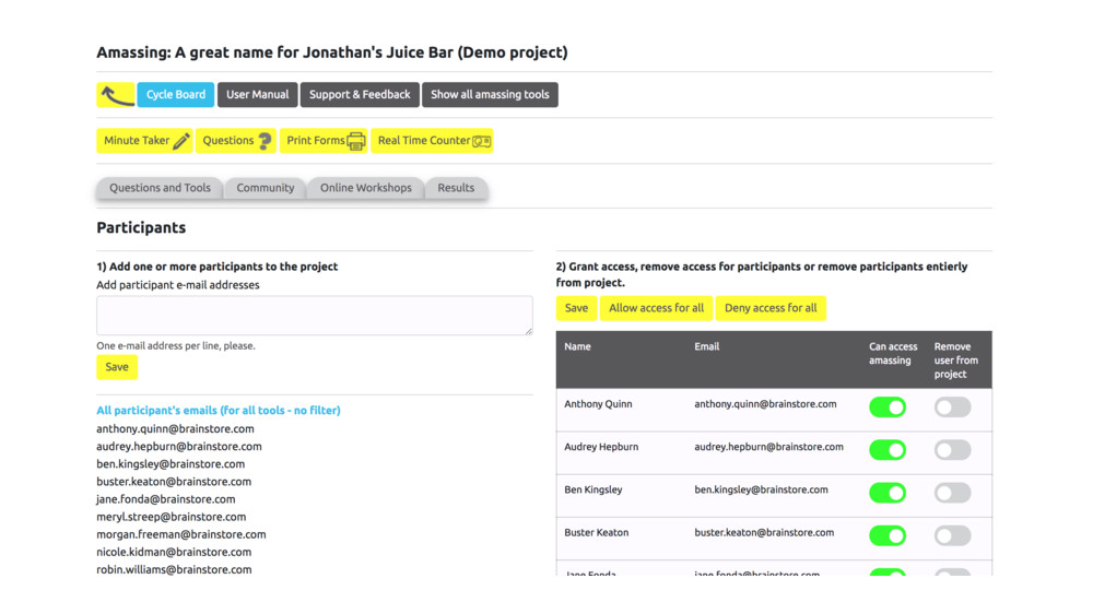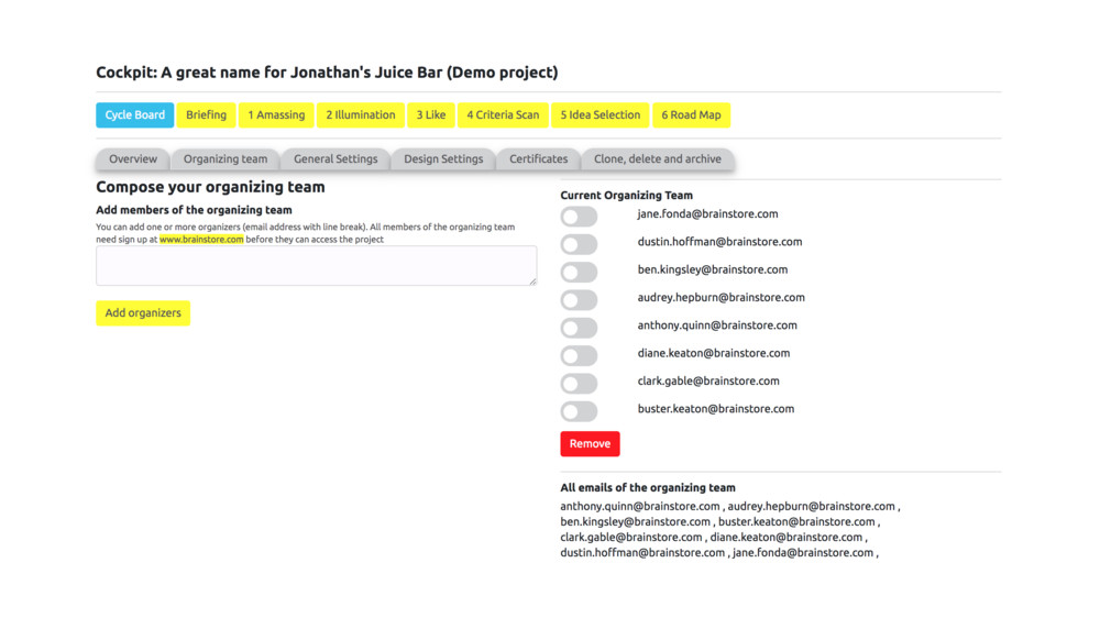 To add members of the organizing team and participants simply add the email address. You can add multiple people at the same time by adding a list of email addresses. Entries need to be separated with "enter".