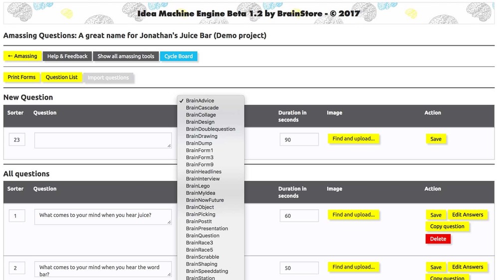 The BrainStore Idea Machine Engine is Beta. So don't trust it 100%. Test the workflow before you work with customers. Currently the application is optimised for the latest version of Google Chrome and for larger screens. Most functions will work in other browsers and mobile browsers, but Chrome is definitely the browser of choice.