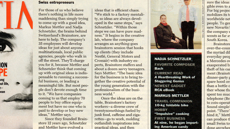 And this idea factory filled every order. The BrainStore, as this fast-growing operation is called, is the brainchild of Markus Mettler, 33, and Nadja Schnetzler, 27. Along with their 31 colleagues, Mettler and Schnetzler have developed a creative approach to the hard work of creativity. Their central proposition: You can't rely on rare flashes of brilliance — "eureka moments" — if you want to produce a steady stream of good ideas. Instead, you must approach the manufacturing of ideas with as much rigor and as much discipline as you apply to the manufacturing of assembly-line products. "Our idea factory has all of the elements of an industrial process," Mettler explains. "You can follow an idea from one step to another."