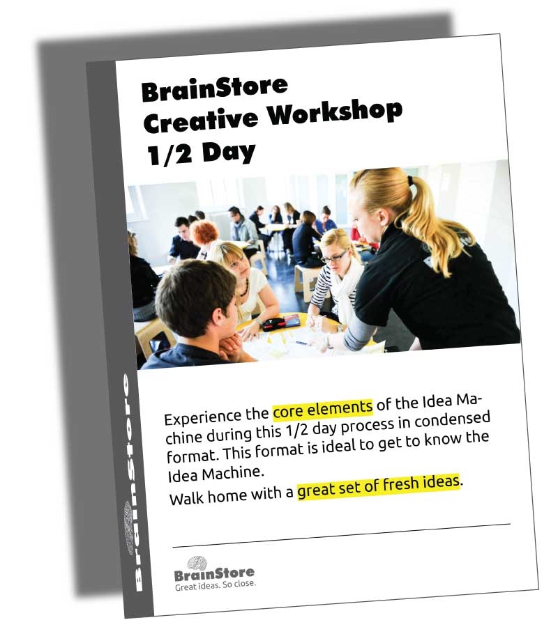 The "Creative Workshop 1/2 Day" is a great format for a simple innovation challenge and to get acquainted with the BrainStore Idea Machine. The workshop is structured in three parts: 1) The amassing phase (goal: quantity). 2) The illumination phase (goal: quality). 3) The like phase (goal: identify the most promising ideas). At the end of the workshop we have a set of concrete ideas, and we know which ideas resonate the most among the participants.