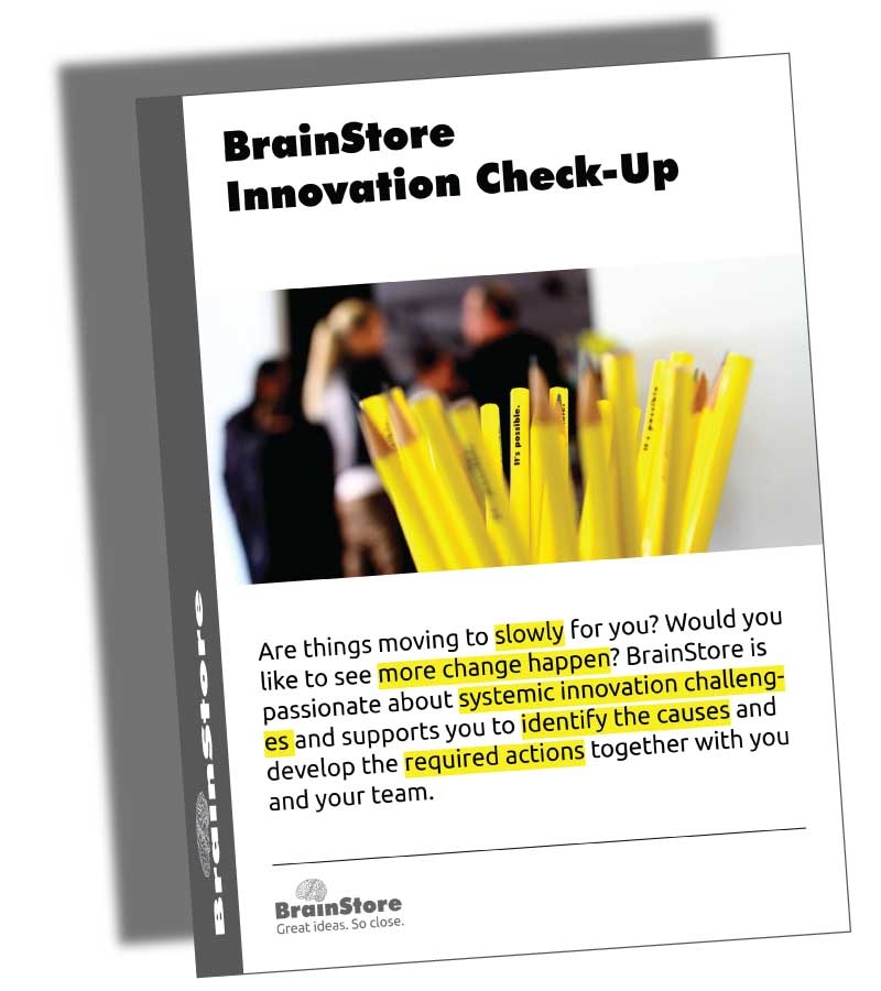 The "BrainStore Innovation Check-Up" is a customised analysis of the innovation work in your organisation. The BrainStore-Team examines how your team applies the key factors of successful innovation work. How good are the briefings? Are the right people involved in innovation projects? What processes are in place? Are the innovators motivated, what motivation factors are used? What happens with leading ideas?